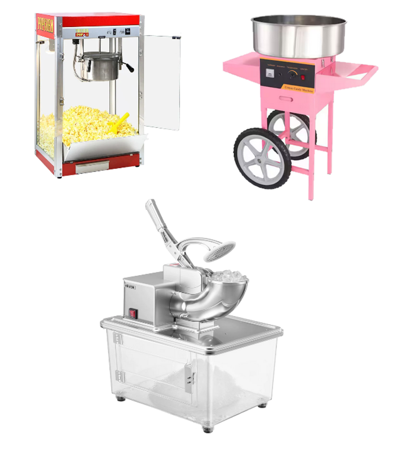 Rent our snow cone, popcorn, and cotton candy machines to delight guests of all ages. Easy to use and full of flavor—plus, hot dog machines coming soon!