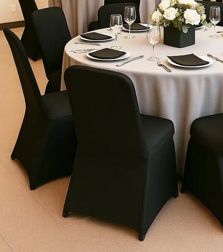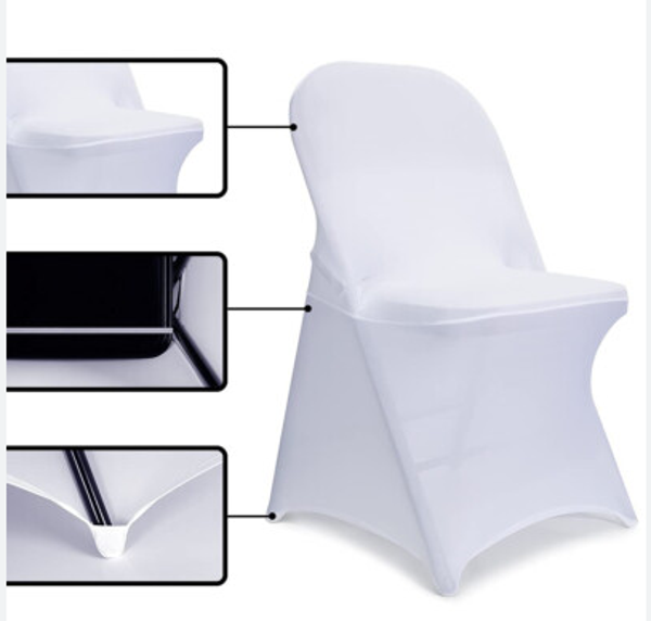 Enhance the look of your event with our foldable chair covers for rental only! Available in elegant white and black, these covers are designed to fit most standard folding chairs, adding a clean and polished finish to any setup.