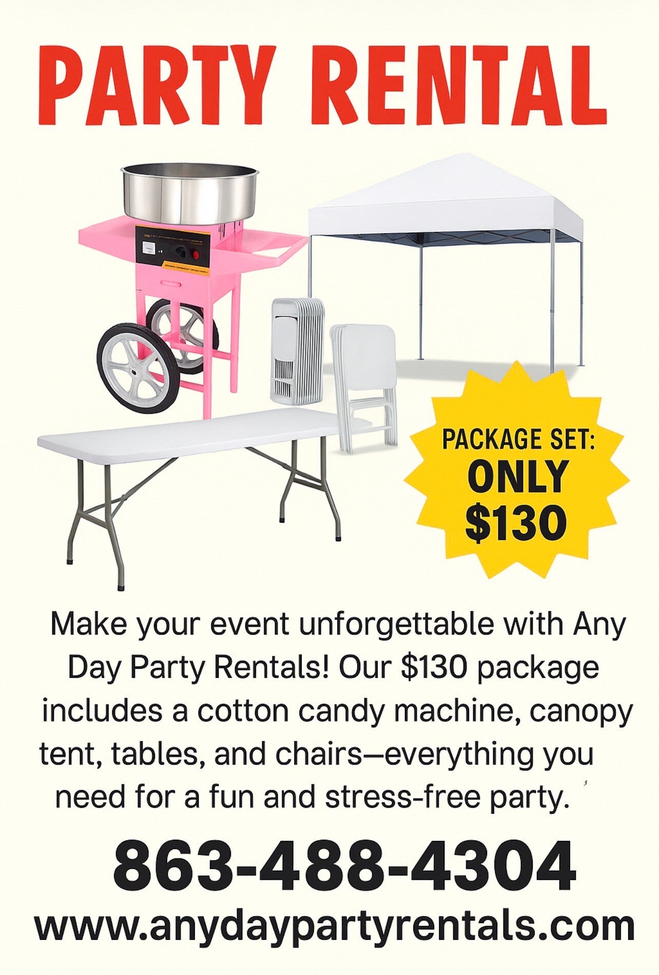 ¡Haz que tu evento sea inolvidable con Any Day Party Rentals! Nuestro paquete de $130 incluye una algodon de azucar, una carpa, dos mesas de 6 pies y 4 pies y 8 sillas: todo lo que necesitas para una fiesta divertida y sin estrés. Llama al 863-488-4304 o visita www.anydaypartyrentals.com para reservar hoy mismo.