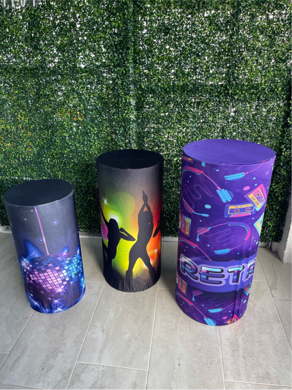 Rental - Bring bold, high-energy style to your party with our 3-Piece K-Pop Demon Hunters Theme Cylinder Cake Covers. Perfect for kids’ birthdays and themed celebrations, these covers transform cylinder stands into a dramatic dessert table display for cakes, cupcakes, and treats.