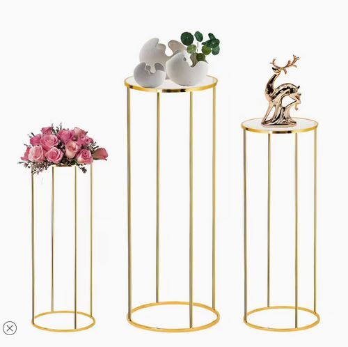 Rent elegant gold cylinder pedestal stands for weddings, birthdays, and corporate events. Perfect for displaying cakes, décor, floral arrangements, or desserts to add a sophisticated touch to any celebration.